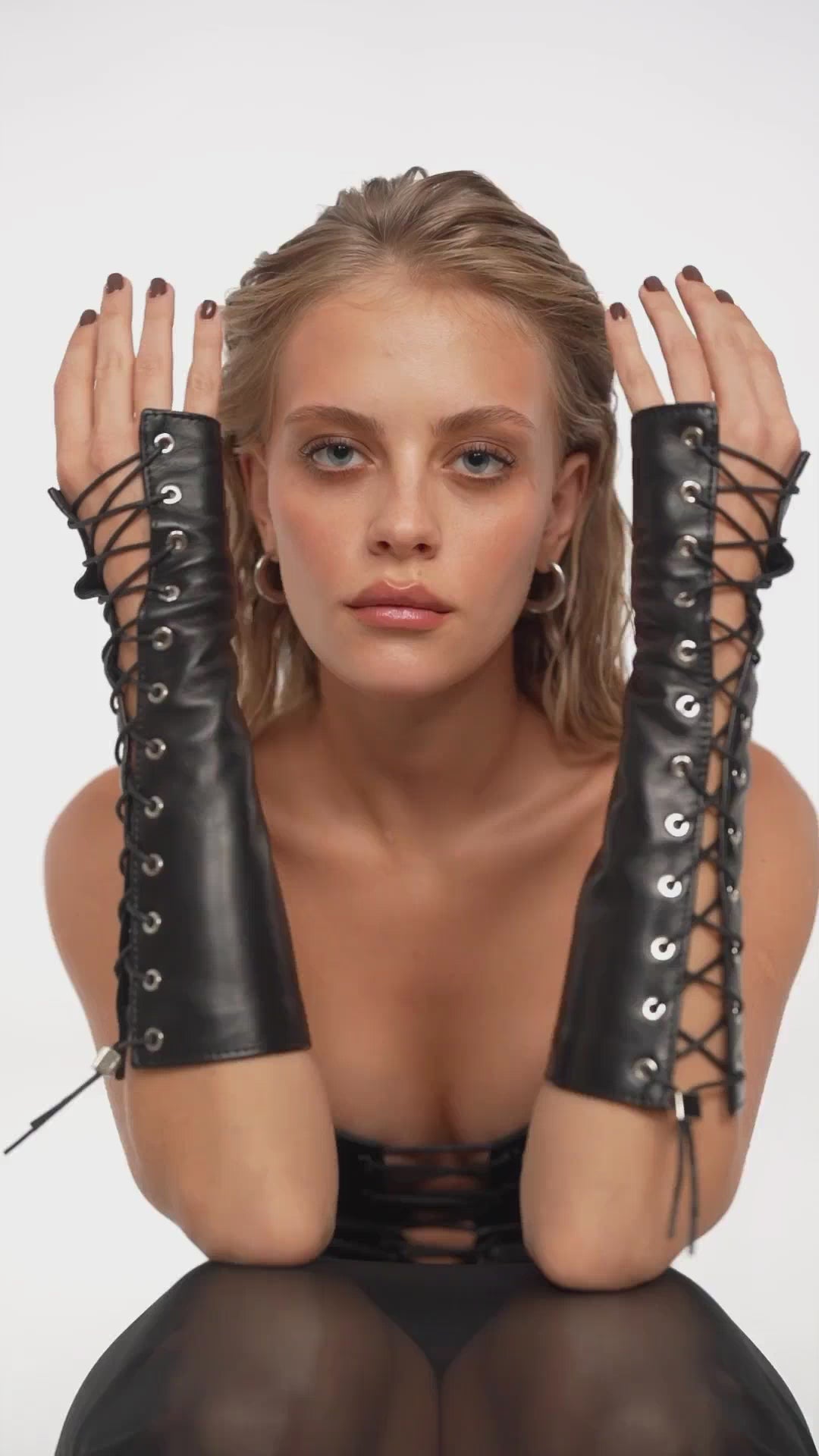 Jaco gloves crafted from a natural high quality leather, featuring black lacing and metal hardware, cover the forearms while leaving the fingers exposed, adding a stylish and edgy touch.
