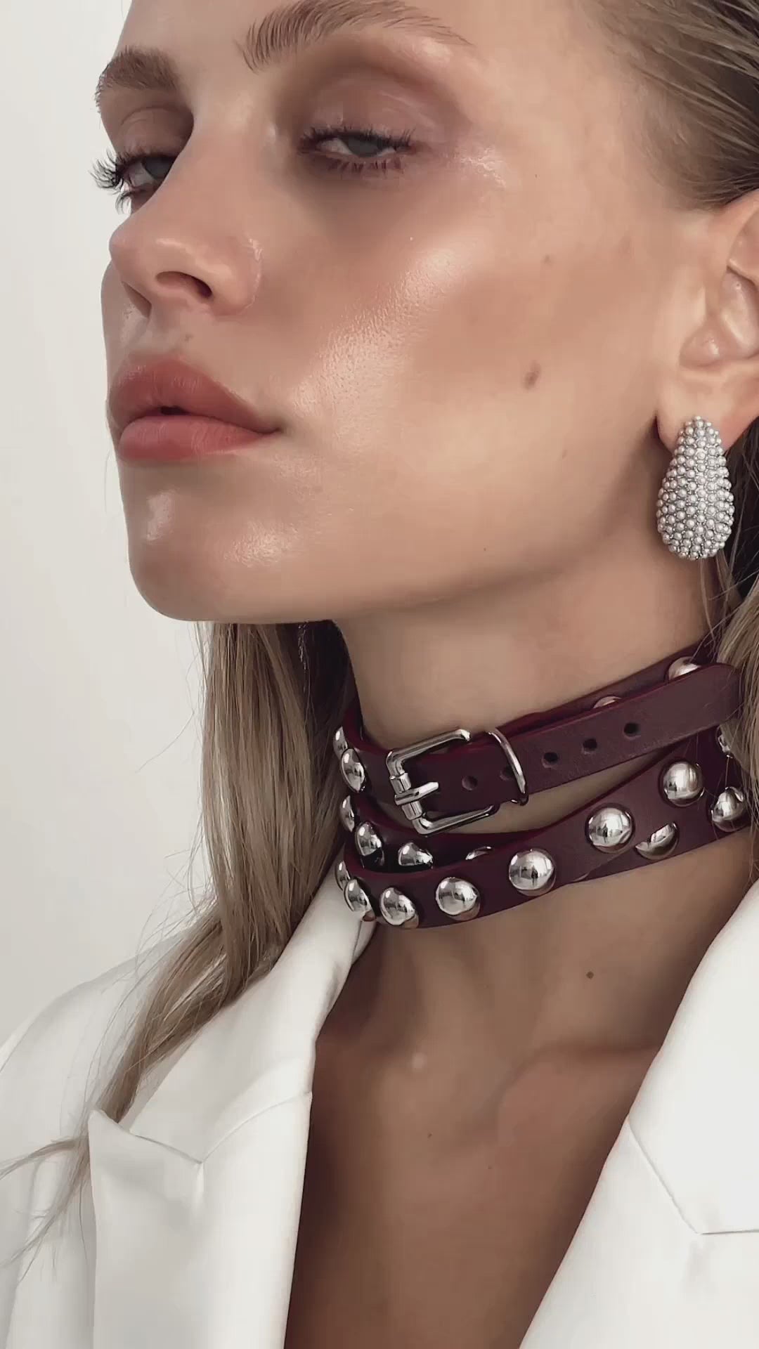 A choker Sirus is made of a natural leather. The smooth leather material wraps comfortably around the neck, offering a subtle yet stylish look. What sets this choker apart are the small metal hemispheres that decorate the strap. These metallic accents create a balanced contrast against the leather, catching the light with a soft shine. The overall aesthetic is a mix of classic elegance and modern boldness, making it a versatile piece that can complement both casual and more refined outfits.
