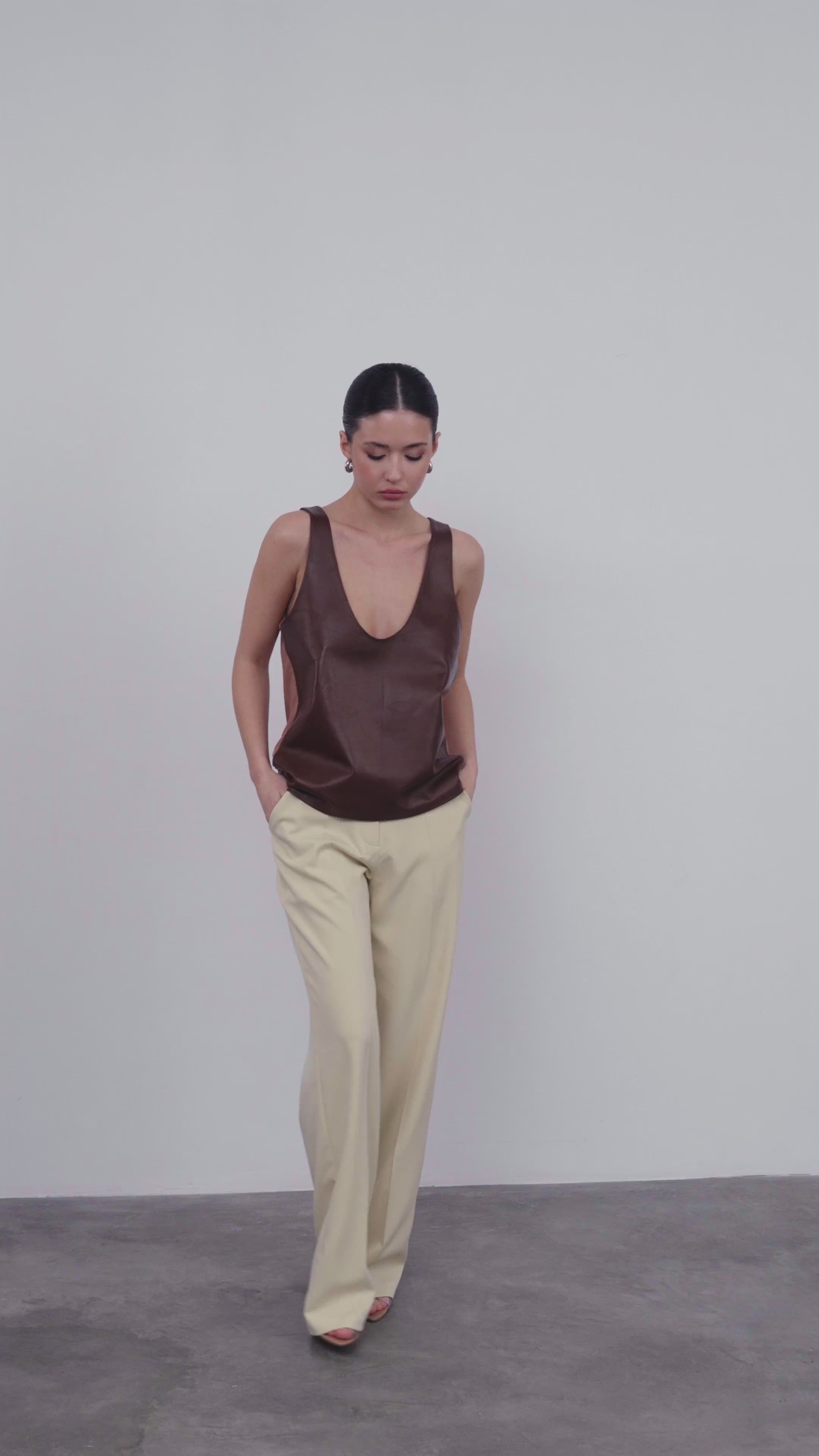 A basic top made from soft lamb leather in a trendy chocolate shade. Features a deep rounded neckline that visually elongates the neck and adds a feminine touch.