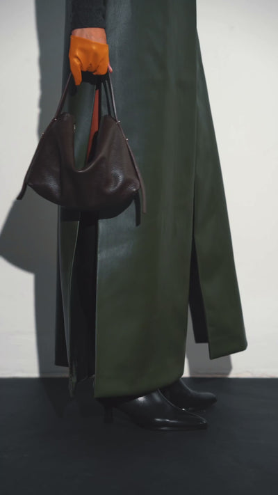 A compact hobo bag made of textured natural leather in a deep chocolate color. Soft lines and the rich shade make it versatile for everyday looks.