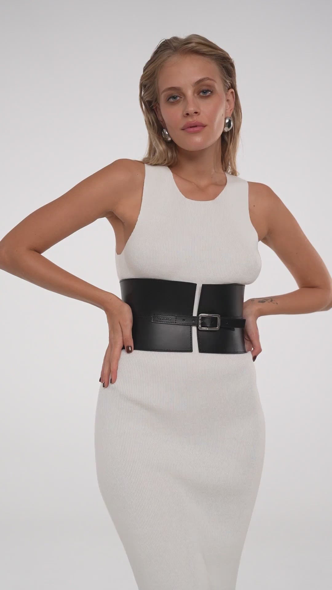 A stylish wide belt Jordana that beautifully hugs the waist and highlights your figure. Its design features a narrow strap connecting the wider sections, adding a unique touch. Made of medium-stiff leather, it holds its shape perfectly while providing a flattering fit.
