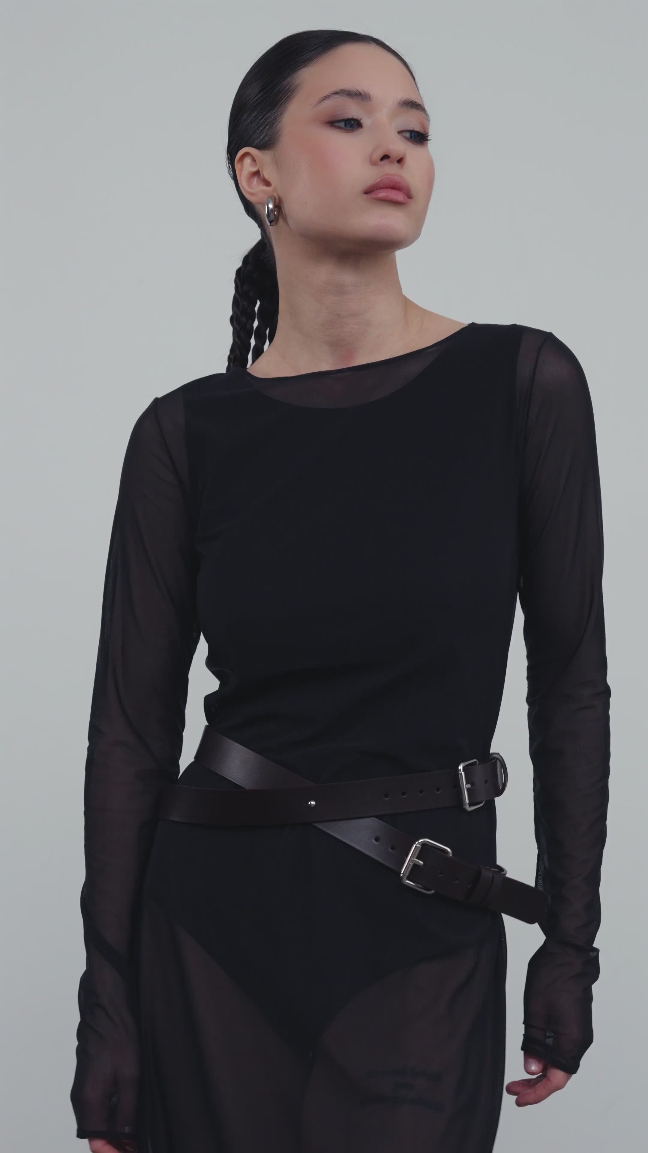Belts made of natural leather, designed to be worn together — crossed, parallel, or separately. Connected by a snap button, they can be easily detached for versatile styling.