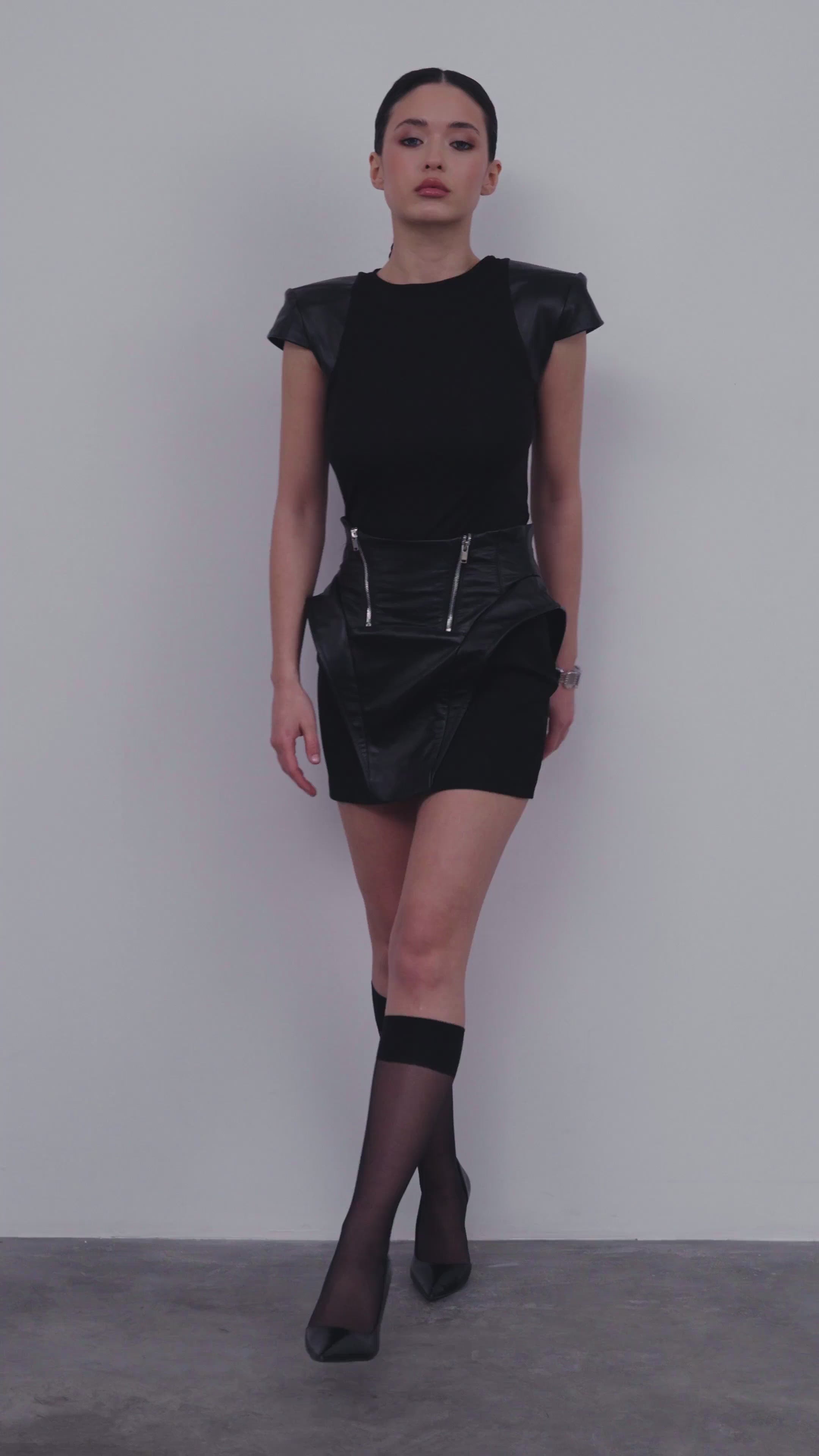 The combination of soft knit fabric with sharp leather shoulder geometry creates a bold silhouette without unnecessary details.