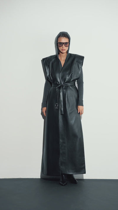 Caleon is made of high-quality eco-leather in classic black. The maxi-length model features a tie belt that allows you to accentuate the waist. To choose the perfect length, simply provide your height.