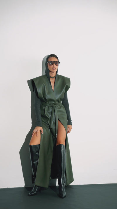 Caleon is made of high-quality eco-leather in a deep green color. The maxi-length model features a tie belt that allows you to accentuate the waist. To choose the perfect length, simply provide your height.
