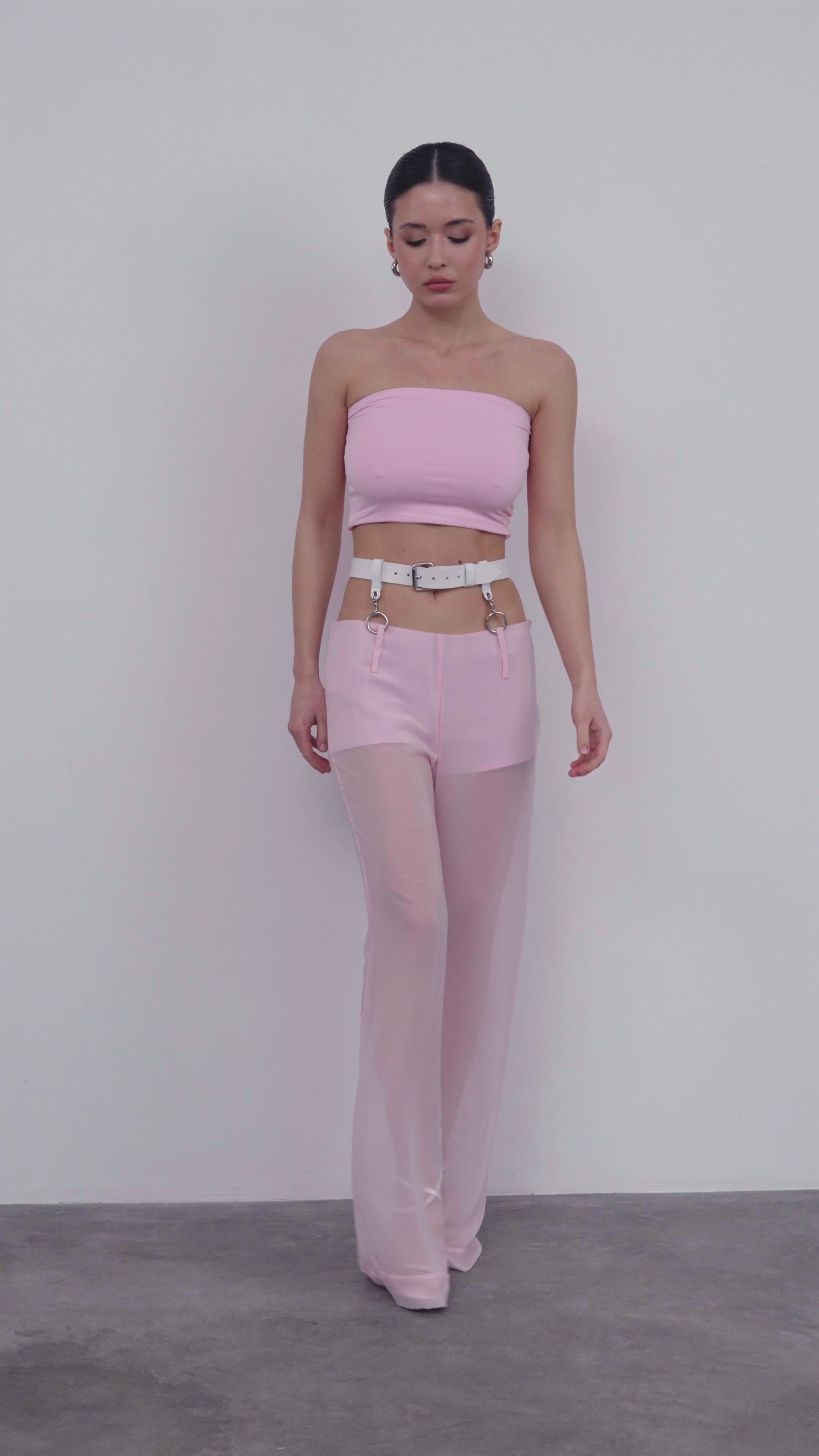 The design brings together two of the season’s key trends: sheerness and a soft pink hue. Perfect for bold looks — whether paired with tops or blazers.