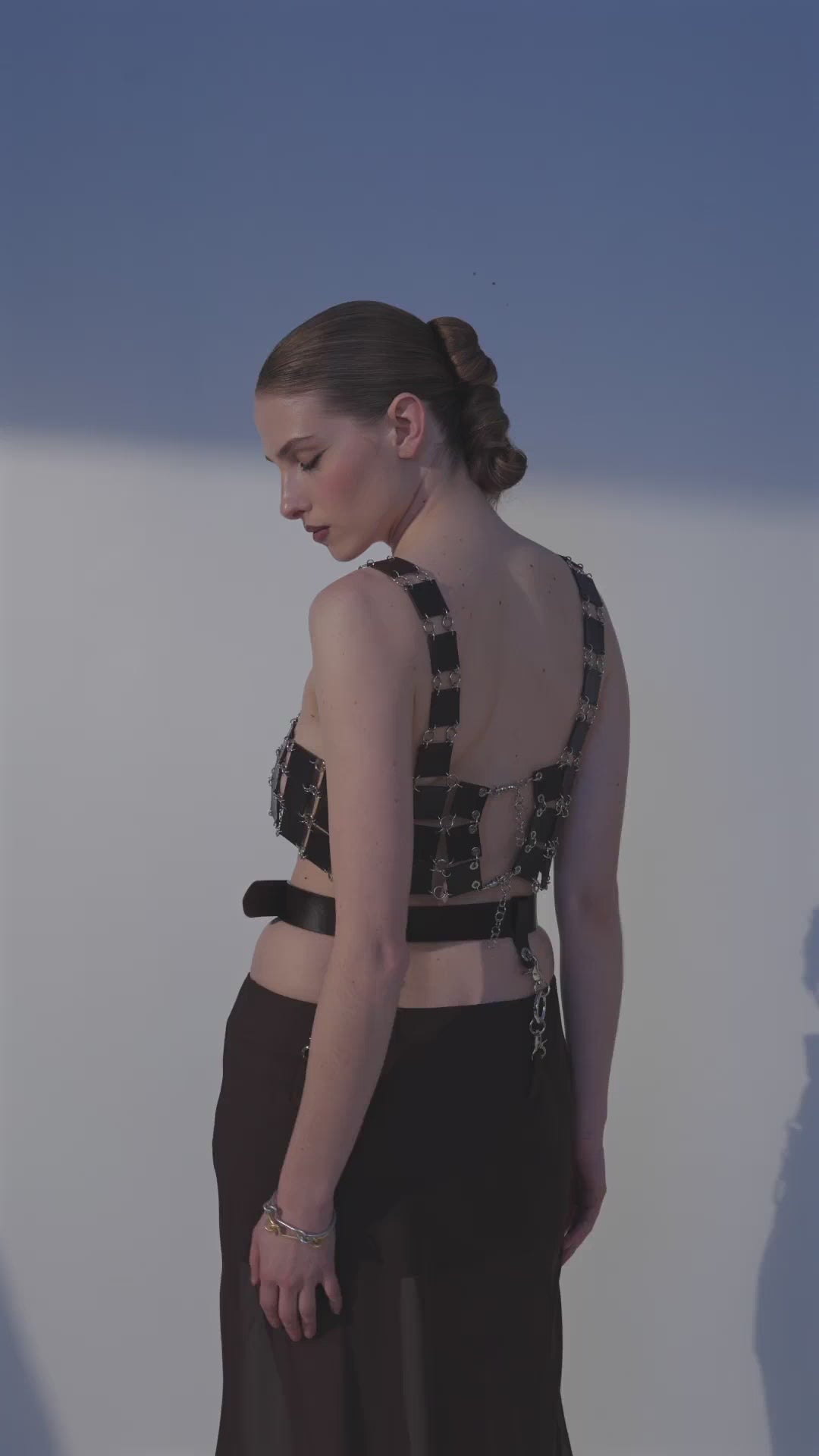 Graphic shape, open space between elements, weight and sound of the hardware — all work towards the main idea: this is not clothing, it is body architecture.